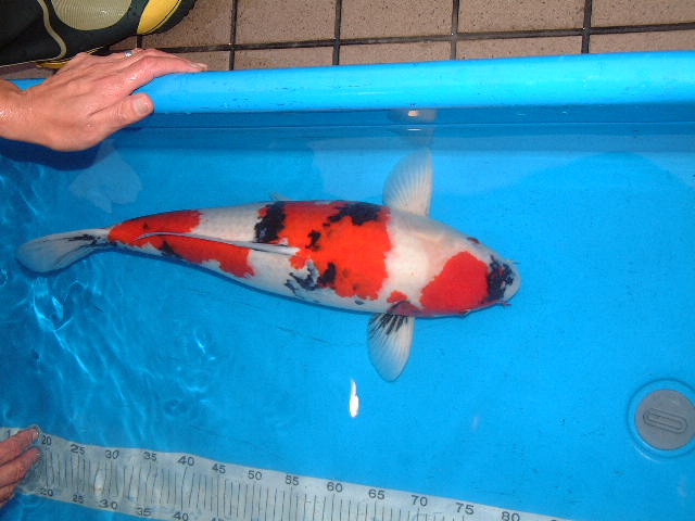 レッズさんの五色が大型鯉に挟まれるようなカッコウとなりましたが、見事存在感をアピール!、がんばりました。一般的には大きな鯉に目がいきがちですが、それを抑えての人気鯉さん受賞となりました。飼育水量の問題もあってジャンボにすることは難しい環境ですけど、この鯉とても網目模様が綺麗です。長く楽しめる鯉ではないでしょうか。ぜひ大切にしてください。 おめでとうございます。 管理人