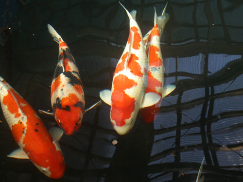 真ん中の写真は親鯉の一部です。中央の紅白は、大日の鯉(80cm!?)で、お客さんが大日で買った鯉をもらったようです。緋食いになっていたのを丁寧になおしたら治ったということのようですが、残念ねんながら頭に緋ムラがあります。体形がよいので、そんなことはあまり気にさせません。なんといっても年齢が15〜16歳というのに驚きます。まだピカピカなんですよ〜。15歳〜20歳ぐらいがピークかな〜と言っていたので、これは本当に息の長い鯉です。生まれは1990年、まだバブルが崩壊していません〜。大日の先代も元気でした〜の時の鯉でしょうか。1度か2度は子取りしていると思うんですが、、子はどうなんでしょ。