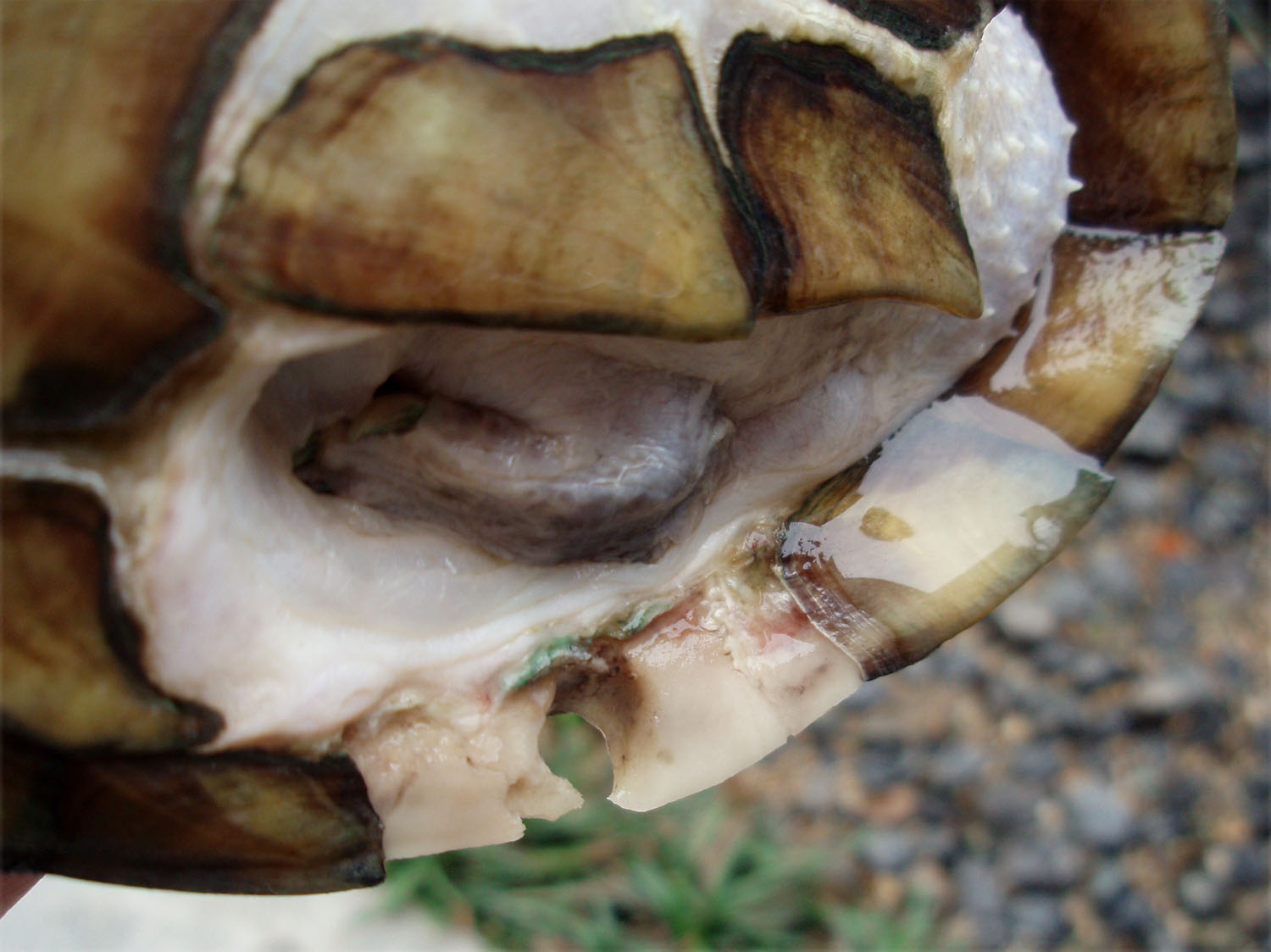 カメの甲羅は骨(肋骨が変形したもの)とそれを覆う表面の角質でできています。その表面の角質が剥がれています。この角質、人間の爪の厚みもありません。甲羅って強力そうですが、実際にはかなりデリケートな感じです。