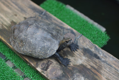 水槽の真ん中でたたずむタイリクミナミイシガメさん。超広角効果でめちゃでかい水槽に見えます。チャッタースピード8分の1秒だと超広角といえども微ブレしてしまいます。