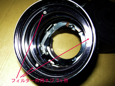 フォーカスリングを左右に回さず、固定用のネジ三本を外して、ゆっくり上に引き抜きます。 |
