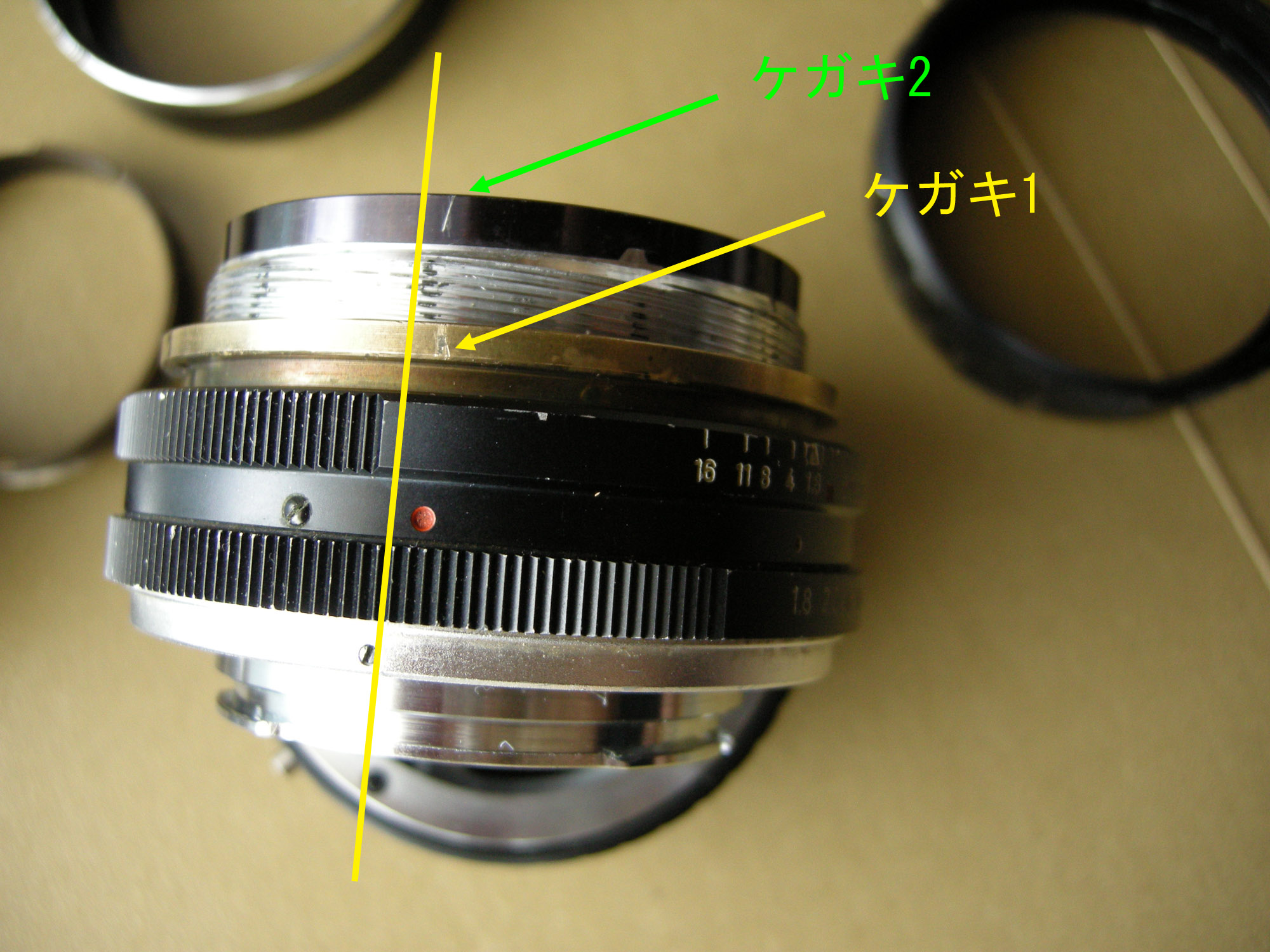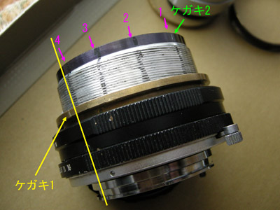 これで銀色ヘリコイドの差し込み口4と金色ヘリコイドのケガキ1を合わせてねじ込めば、両ヘリコイドが正しい位置関係ではめ込めます。 |