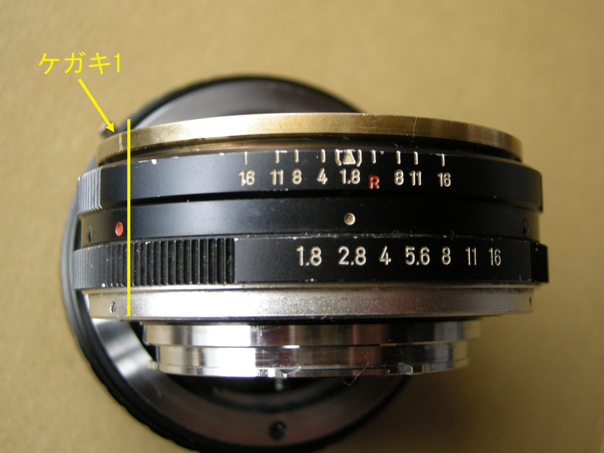 ケガキ1の延長線上の銀色ヘリコイドにケガキ2があります。ケガキ2は元々ついていたマークです。たぶん以前にこのレンズを分解清掃した方が付けたのだと思います。